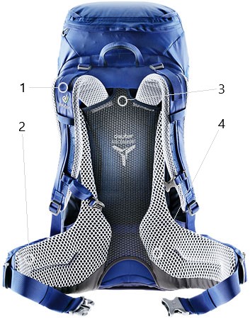 ระบบตาข่ายรองรับหลังที่ออกแบบตามหลักสรีรศาสตร์ที่ผสมผสานการระบายอากาศสูงสุด ความสะดวกสบายและความเบา นวัตกรรมบริเวณสายรัดสะโพกที่ออกแบบให้เชื่อมต่อเข้ากับตาข่ายรองรับหลังช่วยให้ผู้ใช้สวมใส่กระชับสบาย ระบบตาข่ายรองรับหลัง Aircomfort มีโครงสร้างที่ทนทานออกแบบมาจากเหล็กสปริงที่มีความยีดหยุ่นและกันการแตกหัก ทำให้ตาข่ายตึงอยู่เสมอ การระบายอากาศแบบ 3 ทางที่จดสิทธิบัตรโดย Deuter ช่วยลดการสูญเสียน้ำในร่างกายได้ถึง 25%*